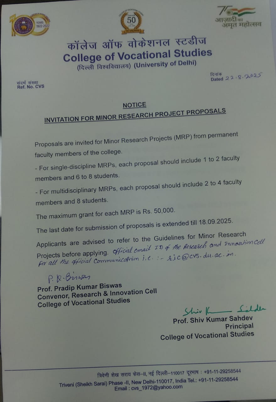 NOTICE FOR MINOR RESEARCH PROJECT PROPOSALS Dated 22.08.2025