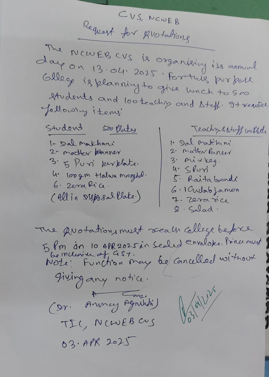 Inviting Quotations for Annual Day of NCWEB CVS and Farewell Party for Students