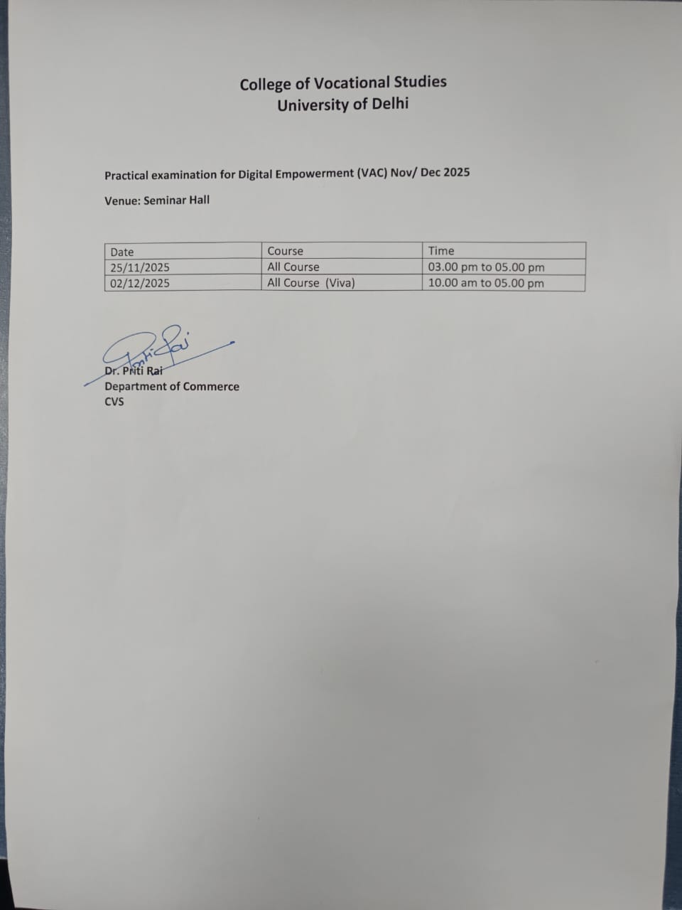 Commerce Dept schedule for practical exam on 4 Dec 2020